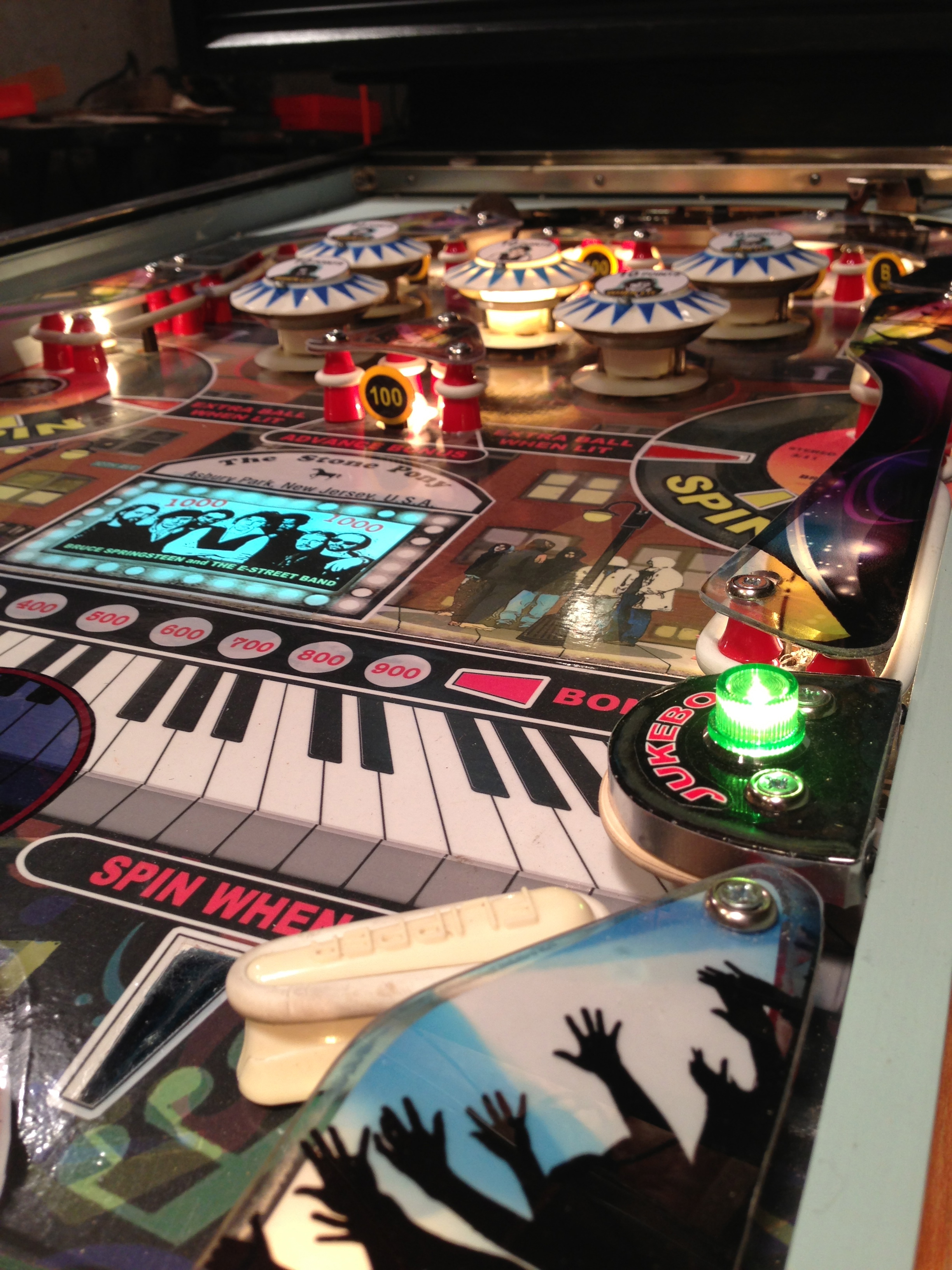 The Jukebox feature is an add-in I designed- a simple push button on the front of the machine cycles through various albums from Bruce’s career. When turned off, the machine rewards players with sound clips from songs for various actions and achievements.